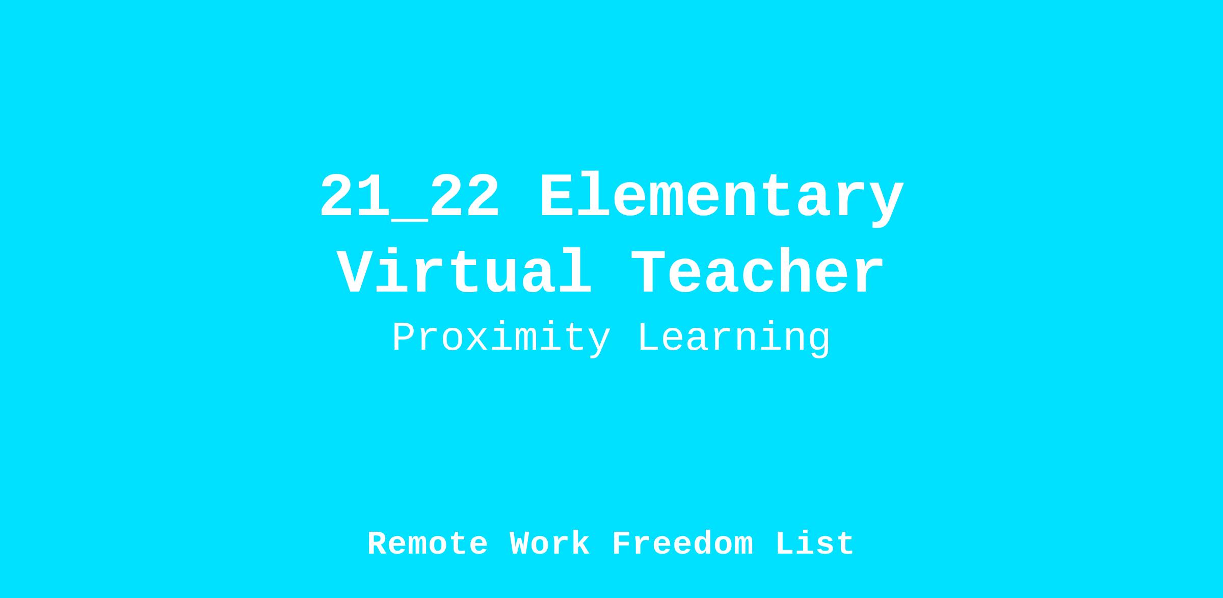 The teacher will implement an appropriate educational curriculum based on Elementary grades' State Standards and the course pacing guides provided by the district. The teacher will create and maintain an educational atmosphere that encourages effective student learning. This person will report directly to the Vice Principals at Proximity Learning. Approved candidates will be placed into an active teacher pool.