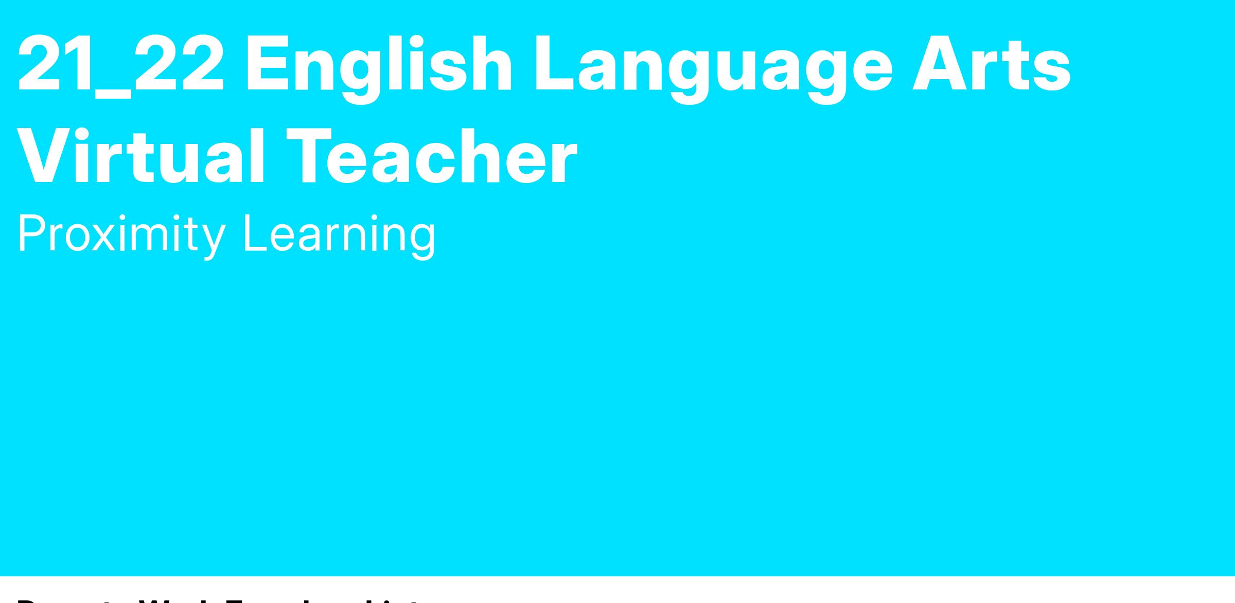 The teacher will implement an appropriate educational curriculum based on State English Language Arts Standards and the course pacing guides provided by the district. The teacher will create and maintain an educational atmosphere that encourages effective student learning. This person will report directly to the Vice Principals at Proximity Learning. Approved candidates will be placed into an active teacher pool.